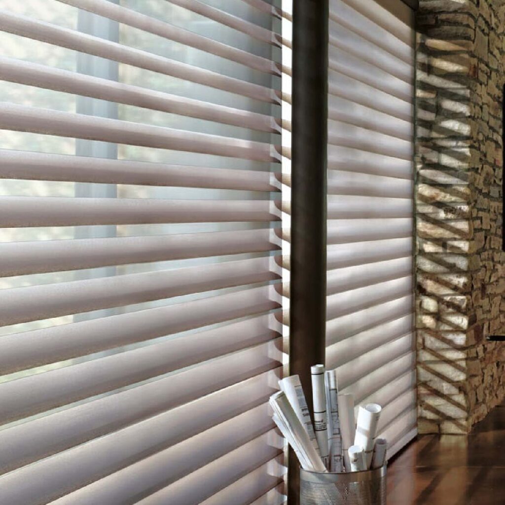 With a genuinely unique design that uses fabric slats suspended between two sheer fabric facings for complete light control and privacy, Triple Shades bridge the gap between Venetian Blinds and Curtains. The shadings can be opened for a gentle view, closed for total privacy, or slanted for adaptable light management.